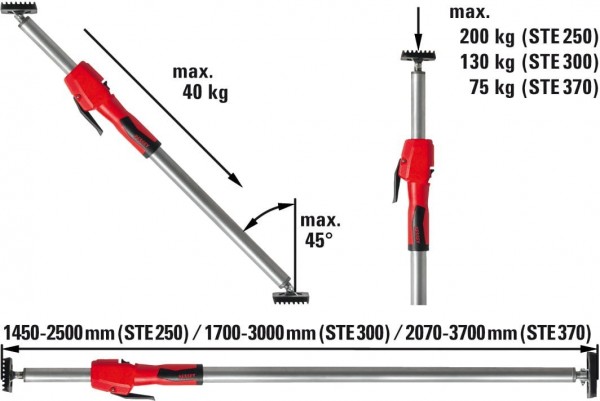 Stropní a montážní podpěra STE s pumpovací rukojetí zaručující spolehlivé a bezpečné upevnění.