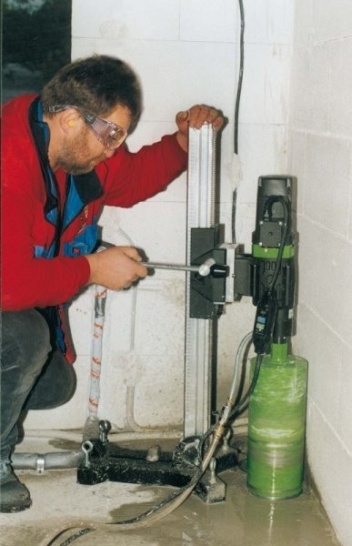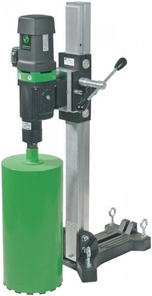 Výkonná dvourychlostní vrtací jednotka pro mokré vrtání armovaného betonu, přírodního kamene a asfaltu.