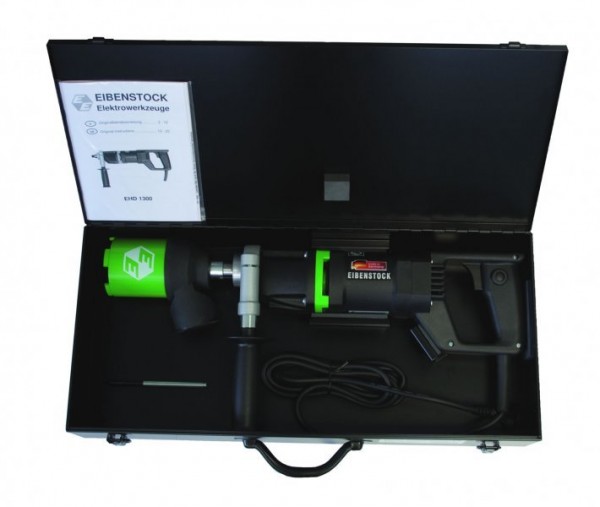Souprava vrtačky na suché jádrové vrtání s nářadím v kufru.