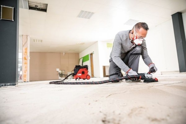 Sanační bruska s variabilními otáčkami pro bezprašné broušení až do rohů, 125 mm.