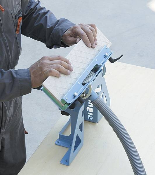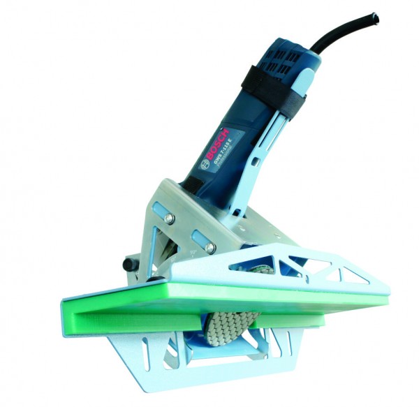 Přípravek k tvoření zkosení hran dlaždic, mramoru a skla za pomoci úhlové brusky.